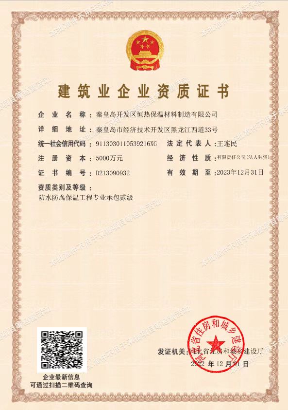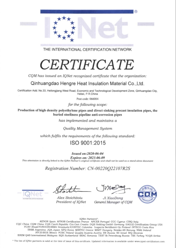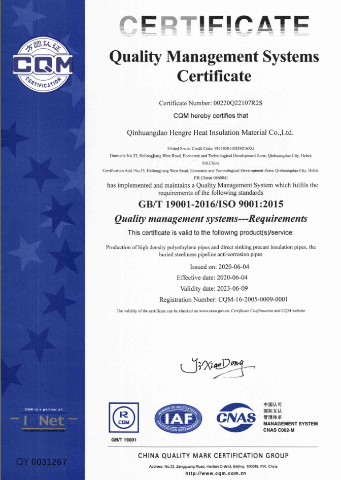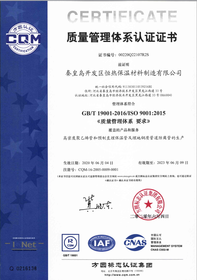 恒熱保溫質(zhì)量管理體系認(rèn)證證書(shū)