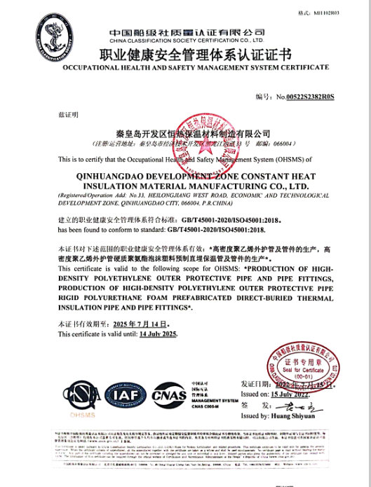 恒熱保溫職業(yè)健康安全管理體系認(rèn)證證書(shū)