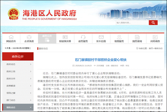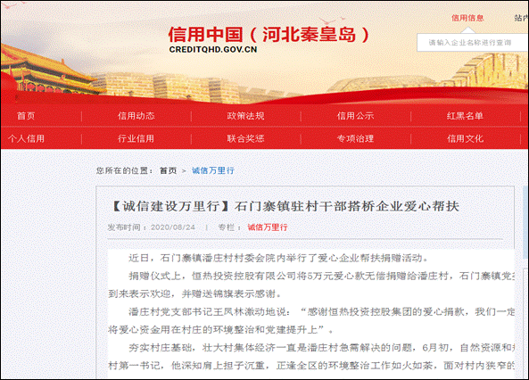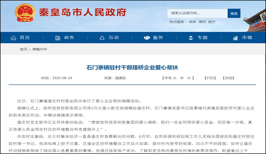 2020年8月7日,恒熱投資控股有限公司將5萬愛心款無償捐贈給石門寨潘莊村,用于該村的環境治理,辦公環境改善和貧困戶、重殘人員幫扶等,解了村里的燃眉之急。近日,秦皇島日報、秦皇島市人民政府、海港區人民政府、信用中國(河北秦皇島)等權威媒體對此進行了報道。