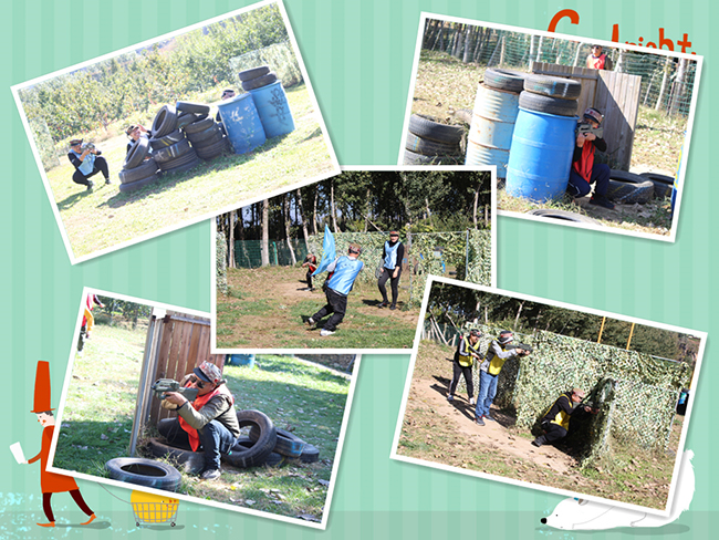 紅隊(duì)隊(duì)長市場經(jīng)營部徐金利,助理中科富斯公司張宏偉;藍(lán)隊(duì)隊(duì)長和助理分別是市場經(jīng)營部耿鍵、牛旭偉;黃隊(duì)隊(duì)長和助理分別是市場經(jīng)營部陸亮亮、倪宏美。選好隊(duì)長和助理之后就立即開始起隊(duì)名、畫隊(duì)旗、定口號、站隊(duì)形。按照規(guī)則,隊(duì)名必須包含隊(duì)長和助理兩個(gè)人姓名中的各一個(gè)字,而口號更是要包含兩人姓名全部文字(可以諧音)。15分鐘準(zhǔn)備時(shí)間里,各隊(duì)成員有的想隊(duì)名,有的畫隊(duì)旗,有的翻手機(jī)查口號,有的編隊(duì)形,各有分工。最終紅隊(duì)命名為“宏利隊(duì)”口號是“張揚(yáng)宏偉,期許盡力”,藍(lán)隊(duì)命名為“鍵牛隊(duì)”口號是“旭偉旭偉,更健更牛”,黃隊(duì)命名為“洪亮隊(duì)”口號為“ 洪亮洪亮!一路有你,你最閃亮!”