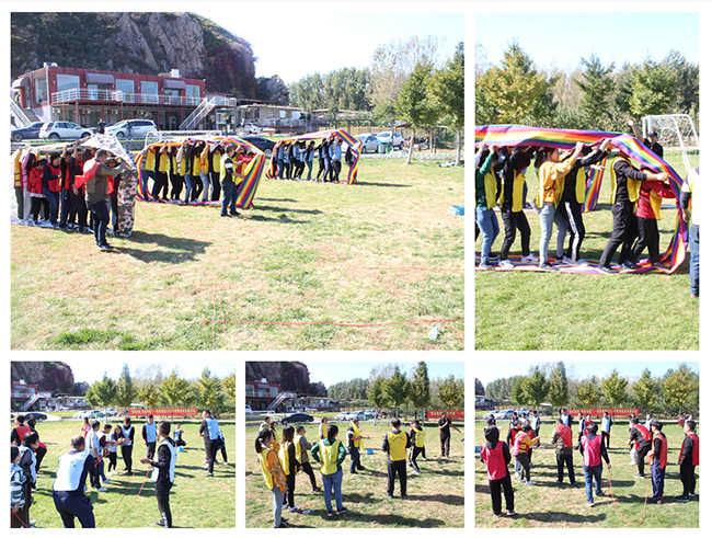 第二個(gè)團(tuán)隊(duì)項(xiàng)目是“車輪滾滾”+“接力傳球”。各組隊(duì)員分別選出10人站在一條巨大的履帶“風(fēng)火輪”中,利用手和腳驅(qū)動(dòng)風(fēng)火輪行走,比配合、比時(shí)間、比速度,最先沖過終點(diǎn)的團(tuán)隊(duì)繼續(xù)用四對繩子傳遞網(wǎng)球,最先將網(wǎng)球投擲到球框內(nèi)的團(tuán)隊(duì)獲勝。兩個(gè)項(xiàng)目結(jié)合在一起是要展現(xiàn)團(tuán)隊(duì)的每一個(gè)成員的重要性,團(tuán)隊(duì)協(xié)作、通力合作是取得成功的關(guān)鍵,只有相信隊(duì)友、信任團(tuán)隊(duì)才能獲得最終的勝利?!败囕啙L滾”項(xiàng)目黃隊(duì)一直領(lǐng)先,藍(lán)隊(duì)緊跟其后,紅隊(duì)因?yàn)榕浜蠁栴}一直落后,來到“接力傳球”項(xiàng)目后,藍(lán)隊(duì)機(jī)智果斷的采用全員一同上陣的戰(zhàn)術(shù),減少了傳球次數(shù),最終贏得了比賽的勝利。這場比賽告訴我們,在日常工作中既要有團(tuán)隊(duì)精神注重相互間的配合,更要在遵守各項(xiàng)規(guī)章制度的前提下,高效穩(wěn)定的完成工作任務(wù)。