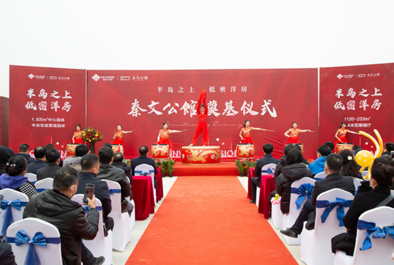 在眾目期待中,8點58分,一段大氣磅礴的鼓上舞正式拉開奠基儀式序幕!主持人上臺一一介紹到場領導和嘉賓,并對他們的撥冗出席表示感謝,隨后對項目進行簡短介紹。緊接著由恒熱集團總裁楊彬先生、秦文房地產開發有限公司總經理霍曉飛先生、秦皇島開發區熱力工程安裝有限公司總經理楊曉松先生分別進行精彩致詞,從集團層次表達了對秦文公館項目的未來期許!