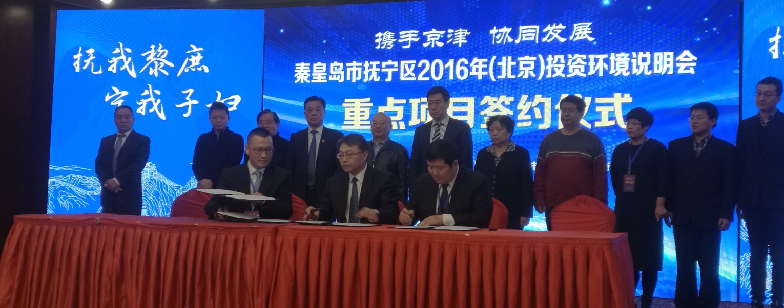 2016年12月19日上午,以“攜手京津,協同發展”為主題的秦皇島市撫寧區2016(北京)投資環境說明會在北京隆重舉行,秦皇島市長張瑞書、撫寧區委書記呂寶全、區長焦大偉、集團總裁楊寶江及中國農業科學院、中國國際投資促進會、中國青旅股份有限公司等近百家企業和單位代表出席。