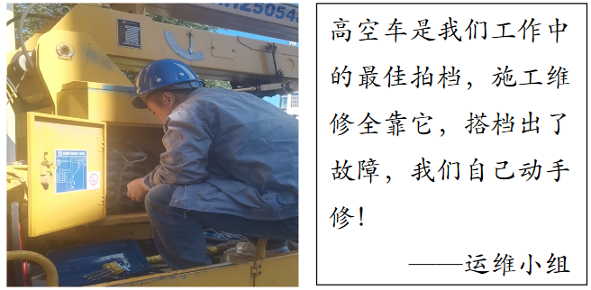 有一次在施工過程中發現高空車的上臂升降功能出現異常,運維小組立即停止作業,查找原因,最終確定是液壓電磁閥出現了輕微故障。經聯系廠家報價3500元,包含配件、修理費、維修工往返差旅費。針對這個故障,運維小組進行了充分的研究、討論和評估,電路方面的問題當然難不倒我們。在確認安全性的前提下,運維小組按廠家標準規格型號購買液壓電磁閥配件,自行拆裝、調試,僅花費320元,就解決了這一問題,高空車上臂升降功能又恢復如初,而且安全性、穩定性不受任何影響。高空車是我們工作中的最佳拍檔,施工維修全靠它,搭檔出了故障,我們自己動手修!——運維小組
